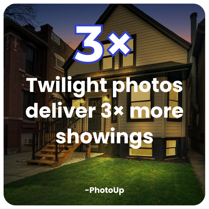 Insights from PhotoUp reveal that twilight images create a dramatic, welcoming feel that draws more attention. Listings with these eye-catching shots often lead to triple the showings.